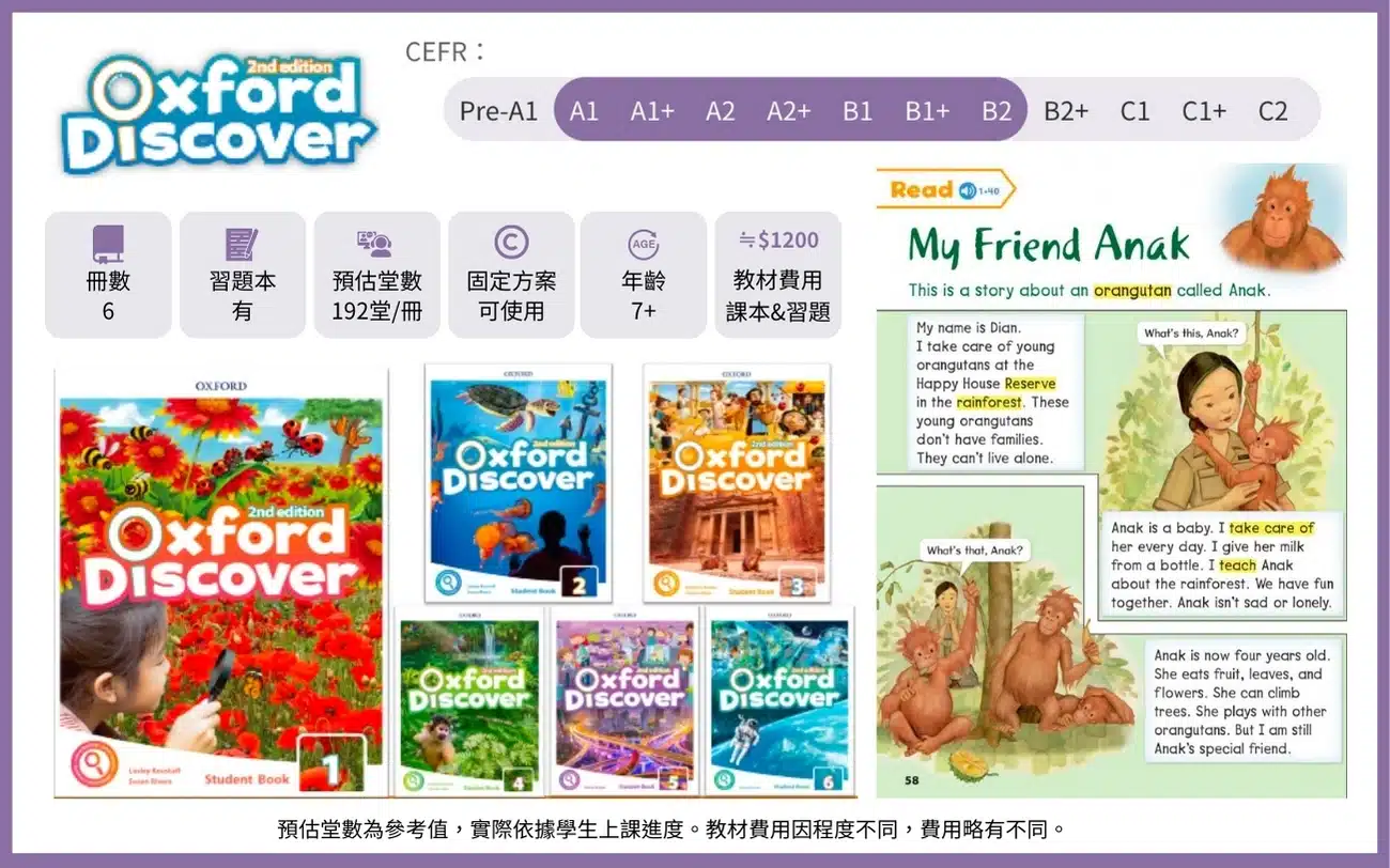 - 《Oxford Discover》系列: 對應 CEFR 的 A1 到 B2 程度。